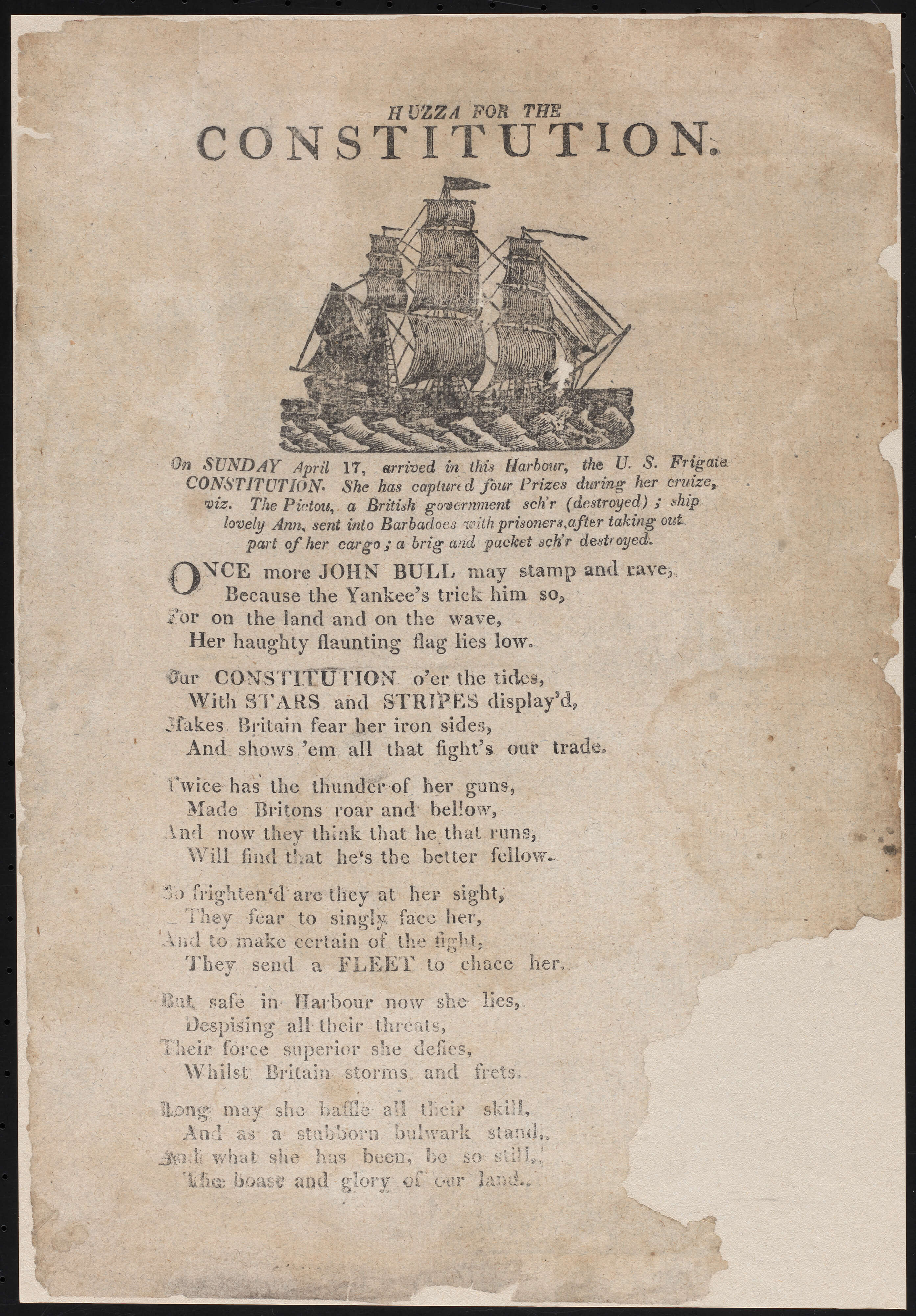 Broadsides are oversized printed sheets containing proclamations, announcements, or advertisements. They were publicly posted or distributed door to door. This broadside with a six-stanza poem commemorates USS Constitution‘s arrival in Boston Harbor on April 17, 1814 after its recent War of 1812 exploits.