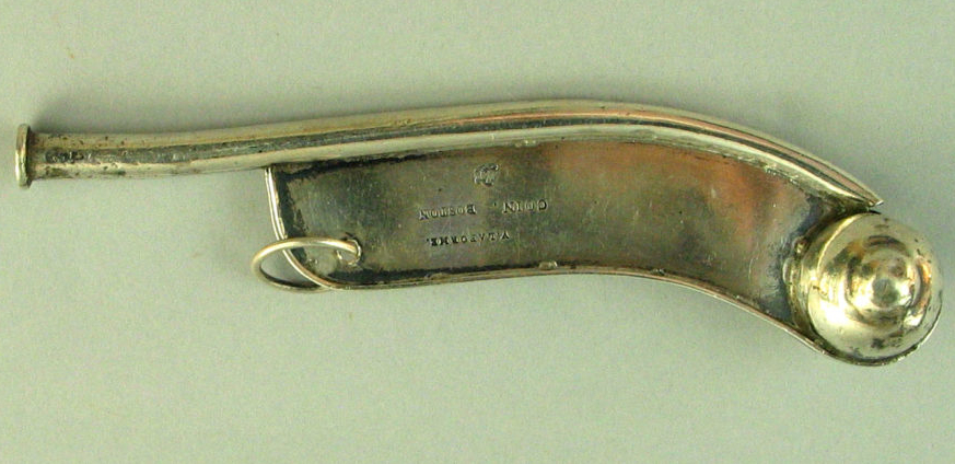 The boatswain’s pipe (pronounced “bosun”) was used for communication on a ship. Its loud and piercing sound woke up sailors and called them to duties throughout the day. It was the job of the ship’s boatswain to play it, and he traditionally carried it on a lanyard around his neck.