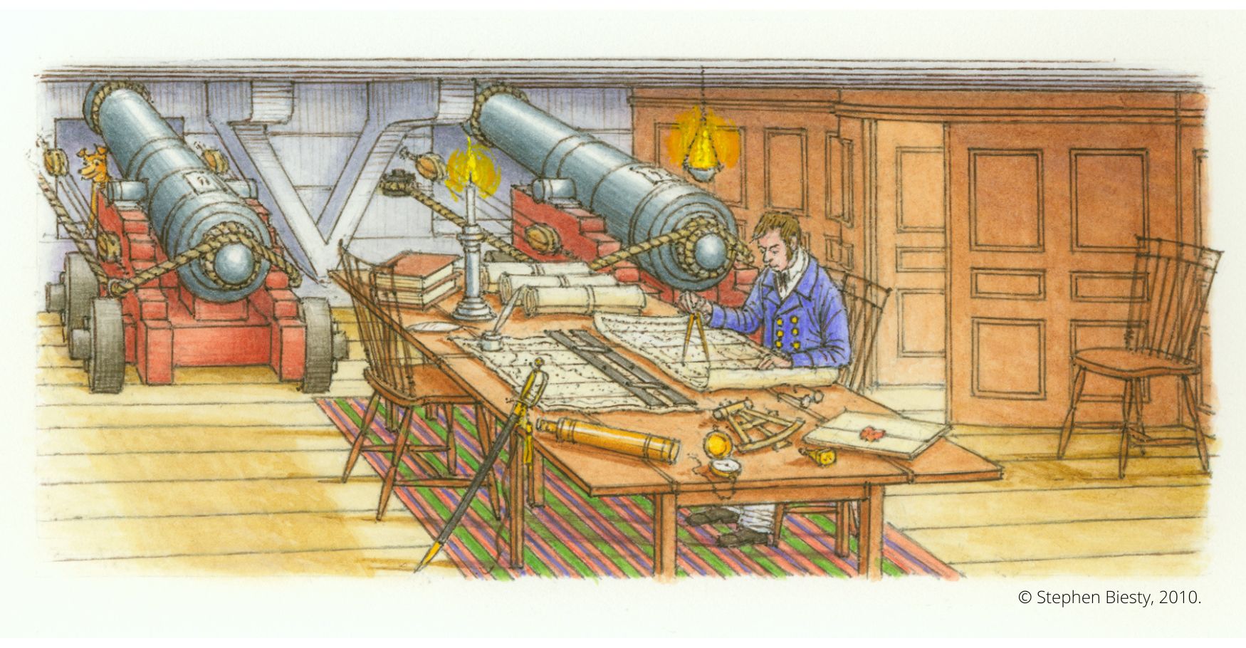 In his quarters at the stern of ship, the captain enjoys a luxury that everyone else aboard lacks: space. In this roomy, calm, comfortable cabin, he plans the ship’s route, and makes decisions that might win or lose a battle – or a war. It’s a big responsibility, and it’s his alone. With the fate of the ship and the lives of its 450 crew in his hands, a couple of luxurious cabins seem small rewards.