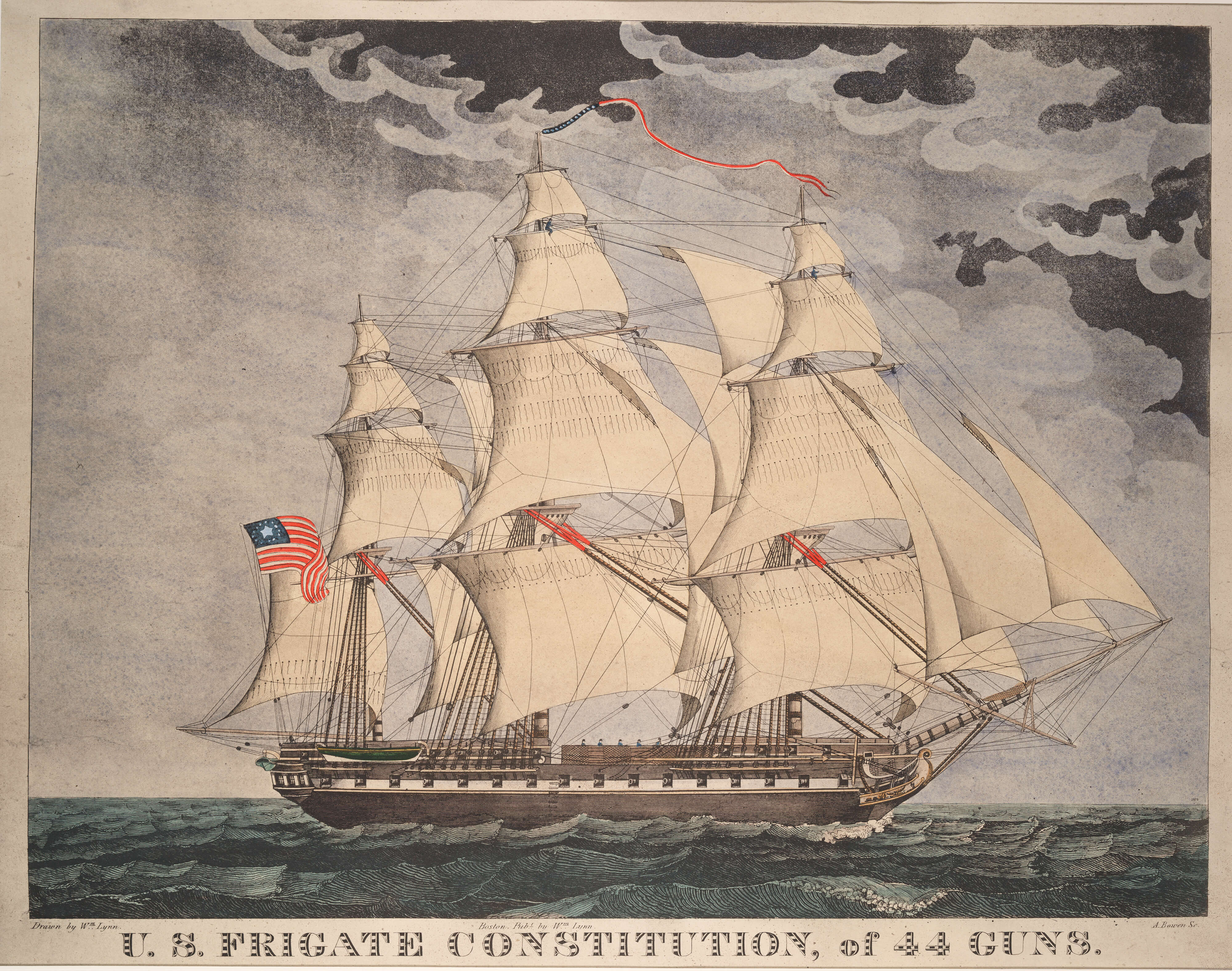 USS Constitution became a patriotic symbol after its victories during the War of 1812. Images of the Ship, like this detailed engraving, were popular among the public in the country at the time. This engraving is especially notable for the accurate depiction of the rigging and sails.