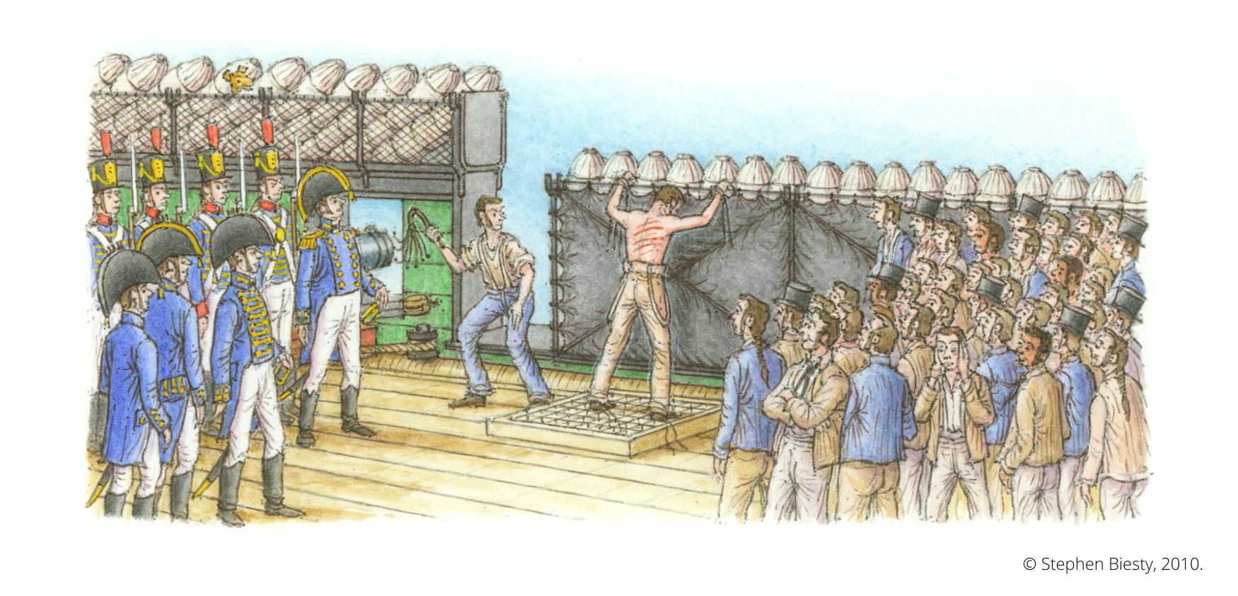 “All hands on deck to witness punishment, ahoy!” This command from the Boatswain brings Constitution’s entire crew to the middle of the ship to watch a flogging. This spectacle is a brutal but effective way to make sure the crew obeys orders. Those who don’t are tied to the ship’s rail, and whipped with nine knotted cords. Flogging is brutal. The lash lifts flesh off the victim’s bare back, spraying it onto the deck and the nearest spectators.