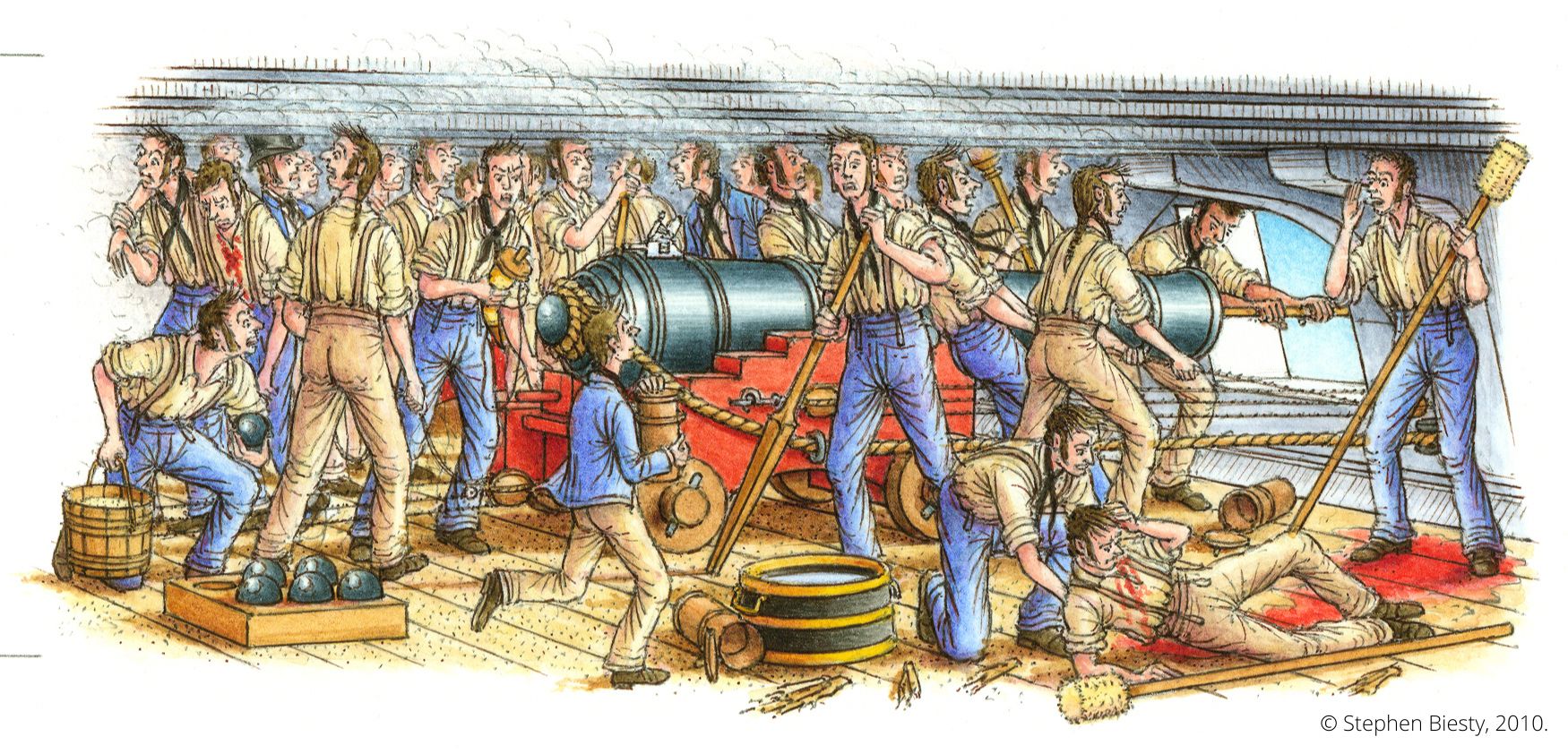Roaring and belching fire, Constitution’s guns were like huge and dangerous dragons when the enemy drew near. Seamen fed their smoking mouths with gunpowder and iron. Thick ropes controlled them, yet with every shot they jerked and lurched, threatening to break loose. Constant training taught each member of the gun crew his job in handling these hot, heavy beasts. Yet nothing could really quite prepare him for the smoke, the noise, the blood and the deadly flying splinters of the gun deck in battle.