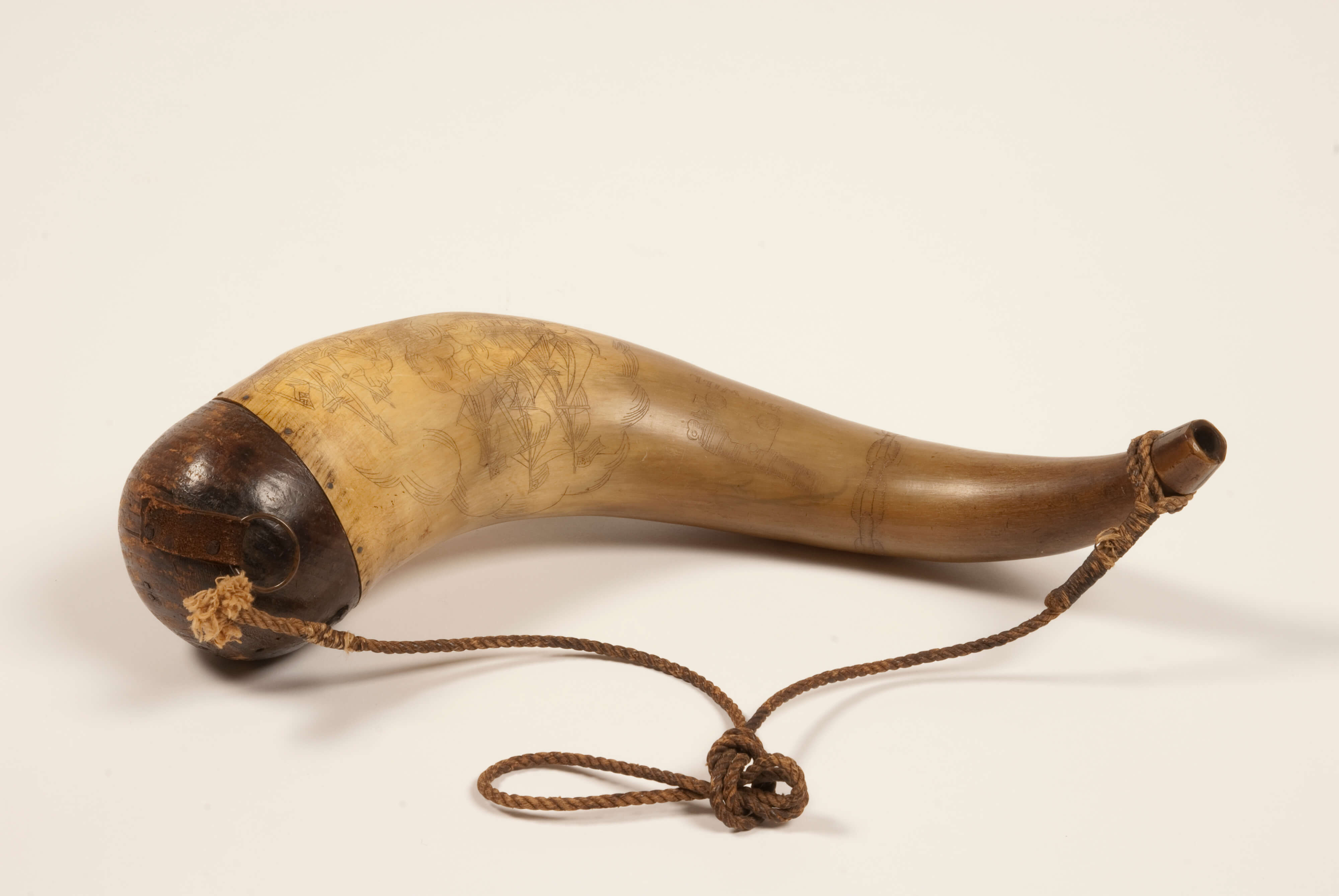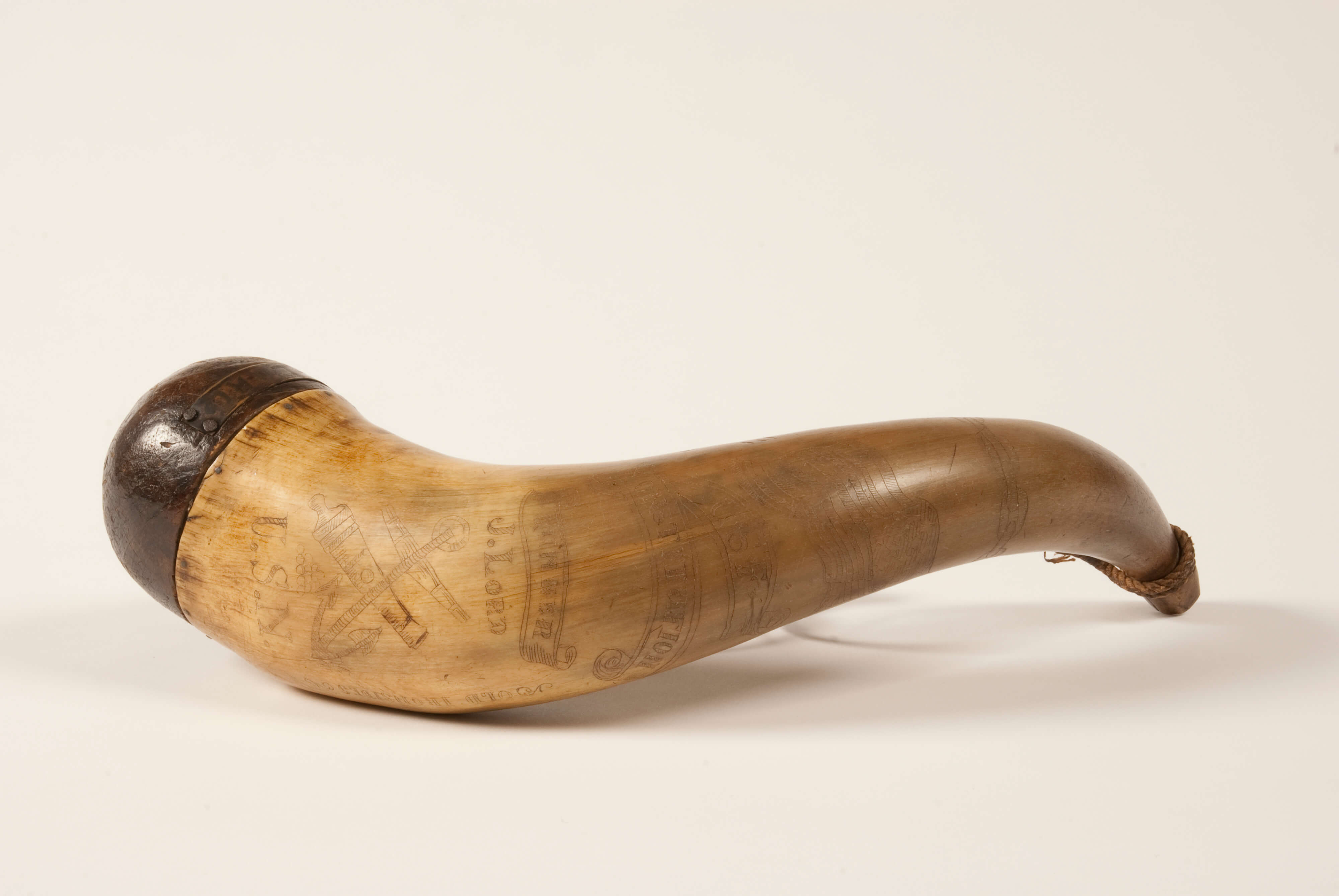 During the War of 1812, powder horns were used to carry the finer gun powder used in the Ship’s long guns. This horn is uniquely decorated with militaristic themes by John Lord, a gunner on USS Constitution from 1824-1828.