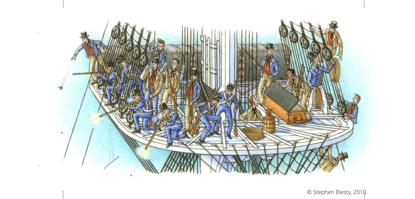 Constitution’s maintop was like a swaying, tree-top fortress when battle began. The ship’s bravest Marines fought from here, aiming to pick off enemy seamen with musket fire. Fixed around the main mast some fifty feet above the deck, the maintop was half the width of a tennis court. It felt much smaller when it was crowded with Marines, and with seamen knotting and splicing rigging damaged by enemy cannon fire.