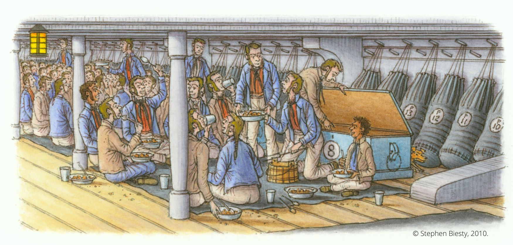 Every sailor on Constitution is part of a 12-strong family called a mess. “Messmates” are not related, but they might as well be, for they are as close as brothers. Each mealtime, they gather in the same spot on the berth deck, spread out a cloth, and sit round it cross-legged to share their food. In a mess,