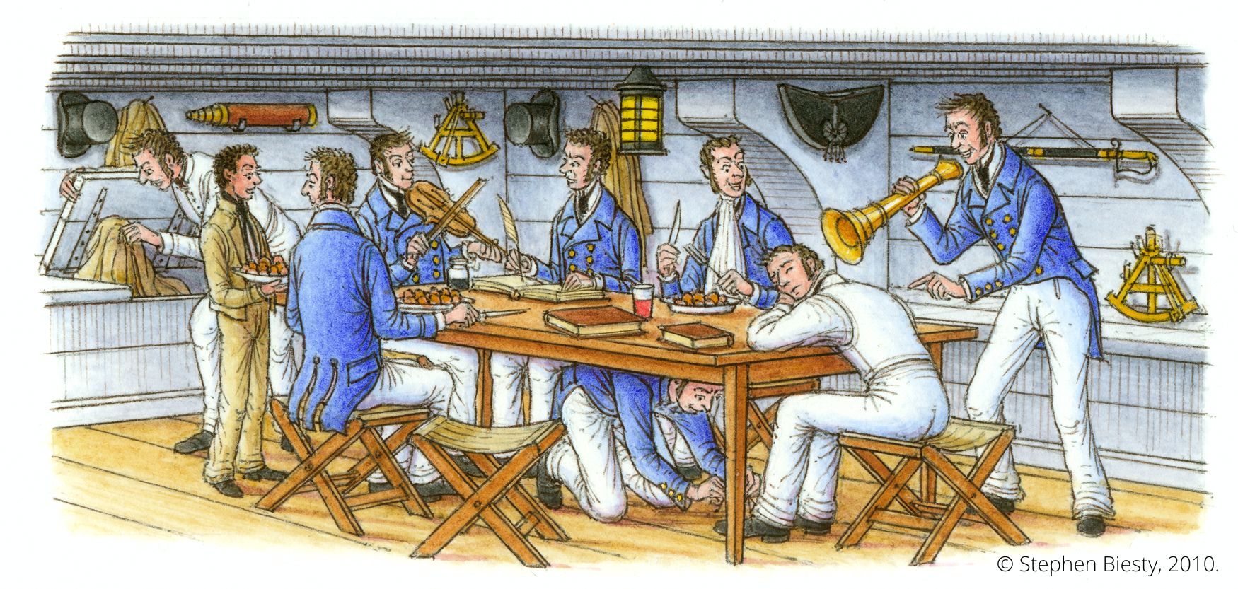 Midshipmen served as Constitution’s trainee officers. Often the sons of wealthy or powerful families, some were as young as 15. Their duties on board were to study, and write journals. As they learned, though, they also stood watches, and the oldest might even command a captured enemy ship. In front of seamen, midshipmen inspired respect by behaving like the officers they hoped to become. But here, in the cramped space they shared next to the wardroom, they could relax, and be loud and rowdy.