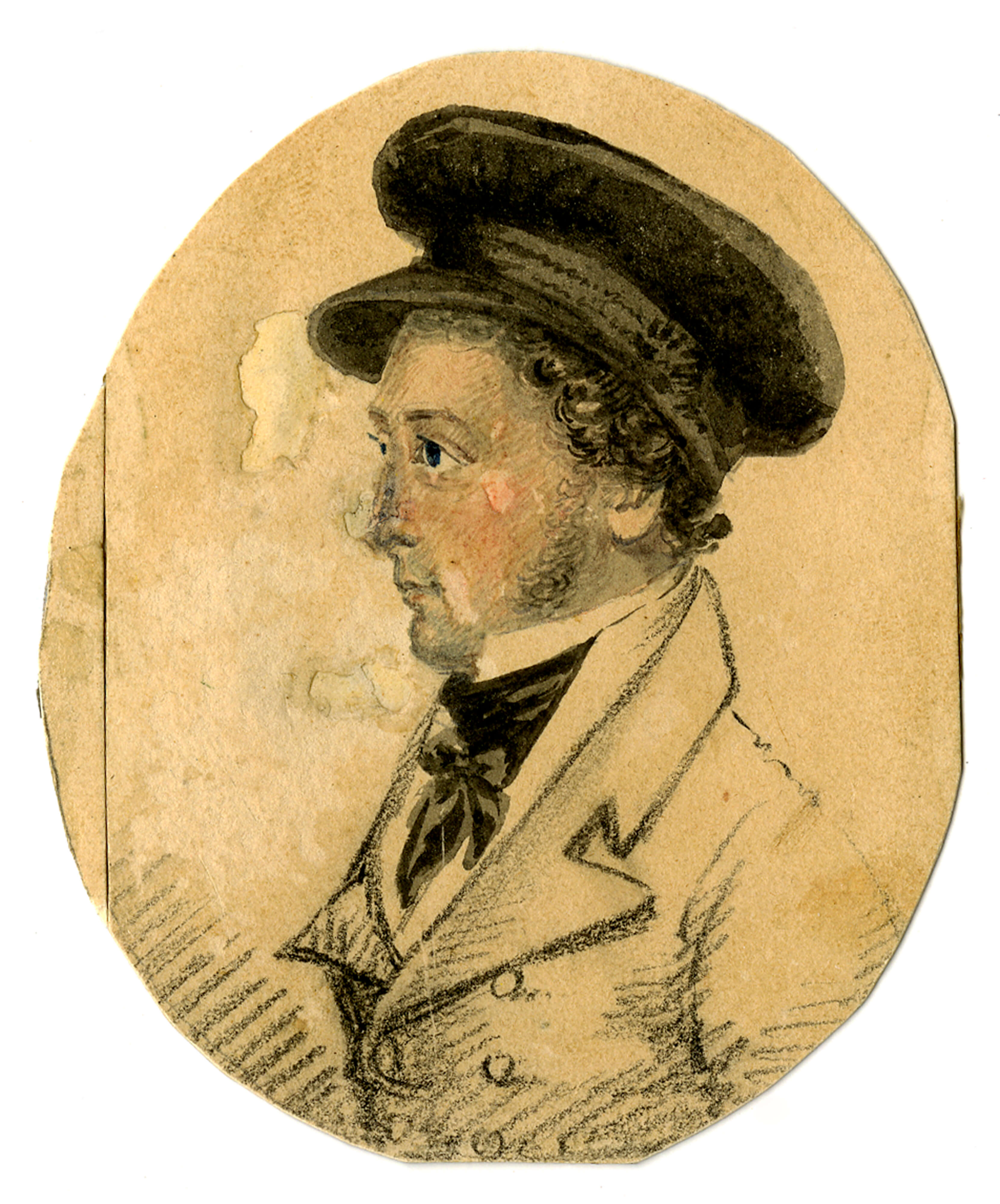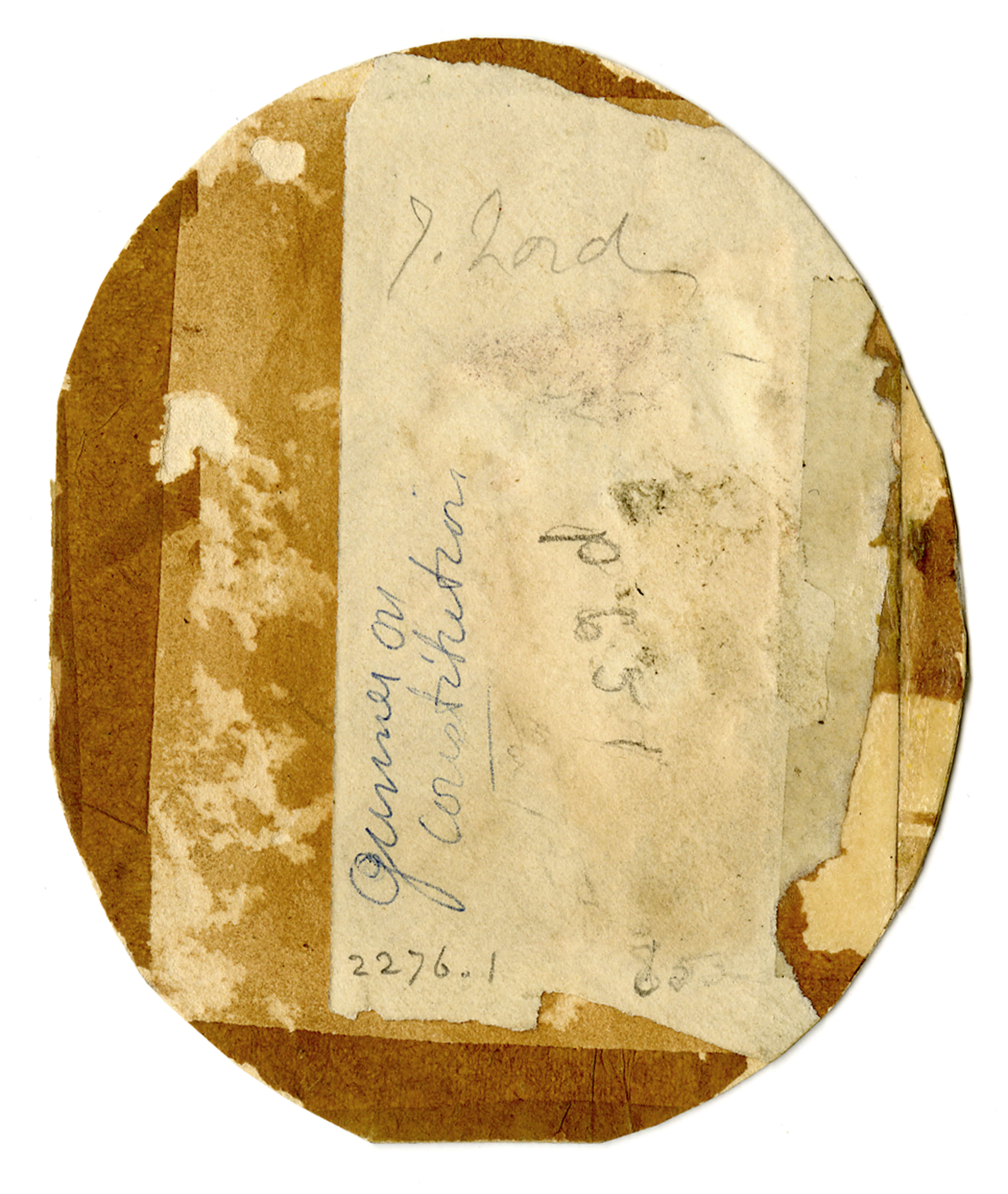 This miniature watercolor portrait depicts John Lord, who served as gunner on USS Constitution between 1824 and 1828. Before photography, miniature portraits were popular keepsakes for remembering a loved one at sea.