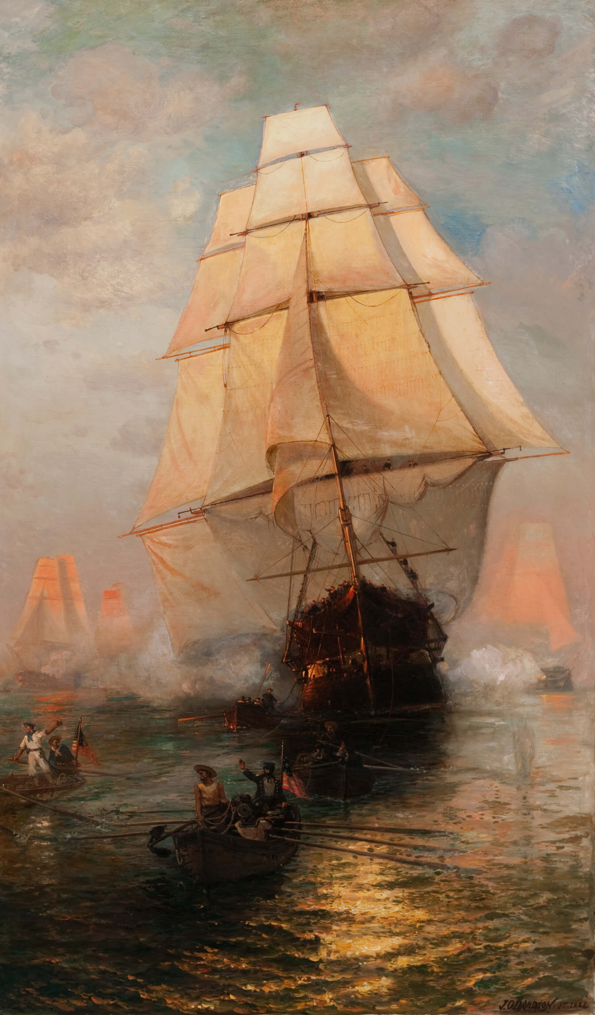 This large oil painting depicts USS Constitution escaping a British squadron. This event was the culmination of a three-day chase where there was no wind. As a result, Constitution’s crew had resorted to towing the ship with boats and kedging with an anchor in an effort to escape.