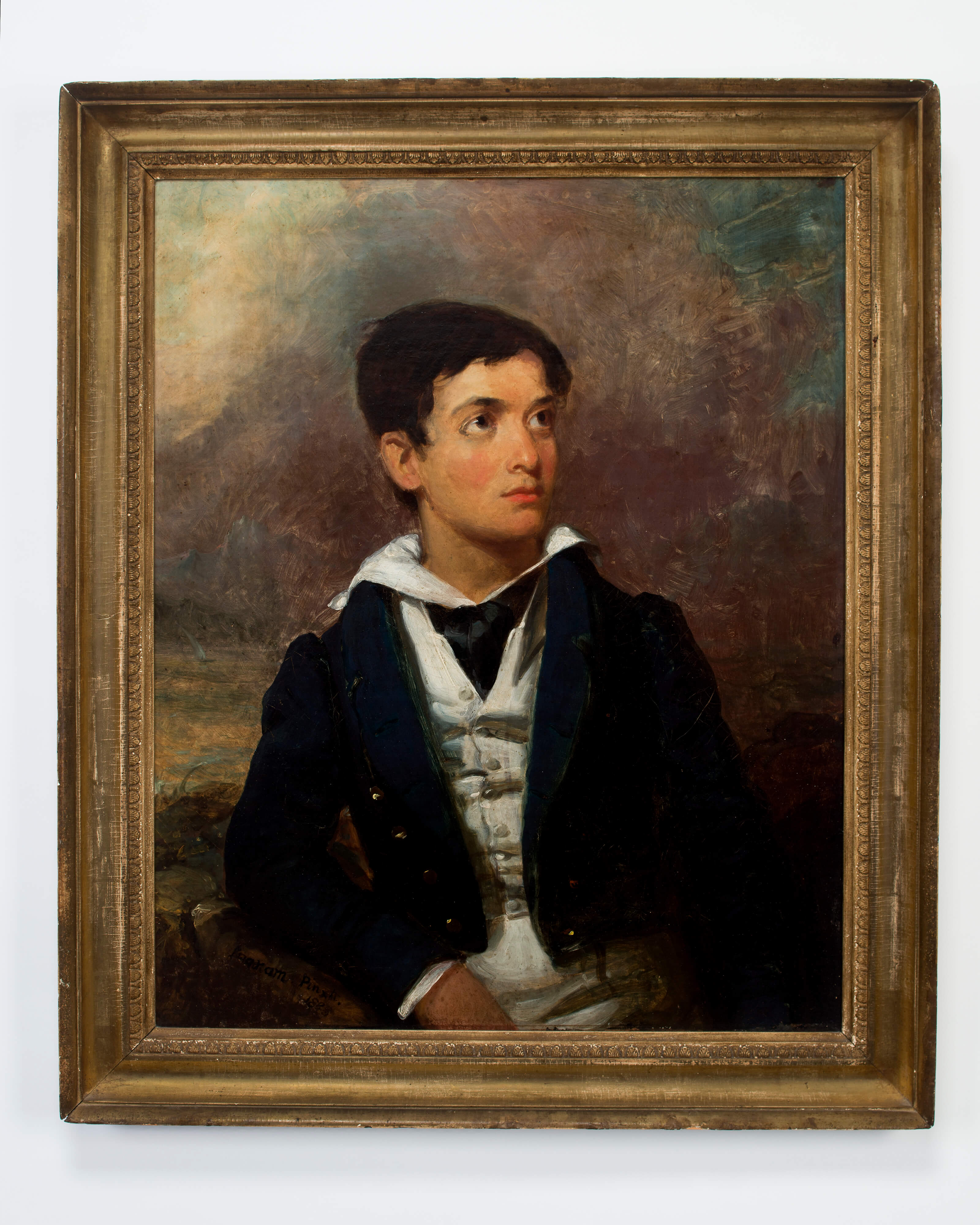 This is a portrait of George Sirian, who was orphaned as a boy in 1824 while escaping war in his home of Psara, Greece. The young refugee joined USS Constitution‘s crew in May of 1827 at nine years old. He served first with the rank of boy, and then ordinary seaman. A lieutenant took Sirian under his wing and later sponsored his education and naval career. While portraits of captains and officers were more commonplace, this portrait of a ship’s boy is a rare historical glimpse of the enlisted crew.