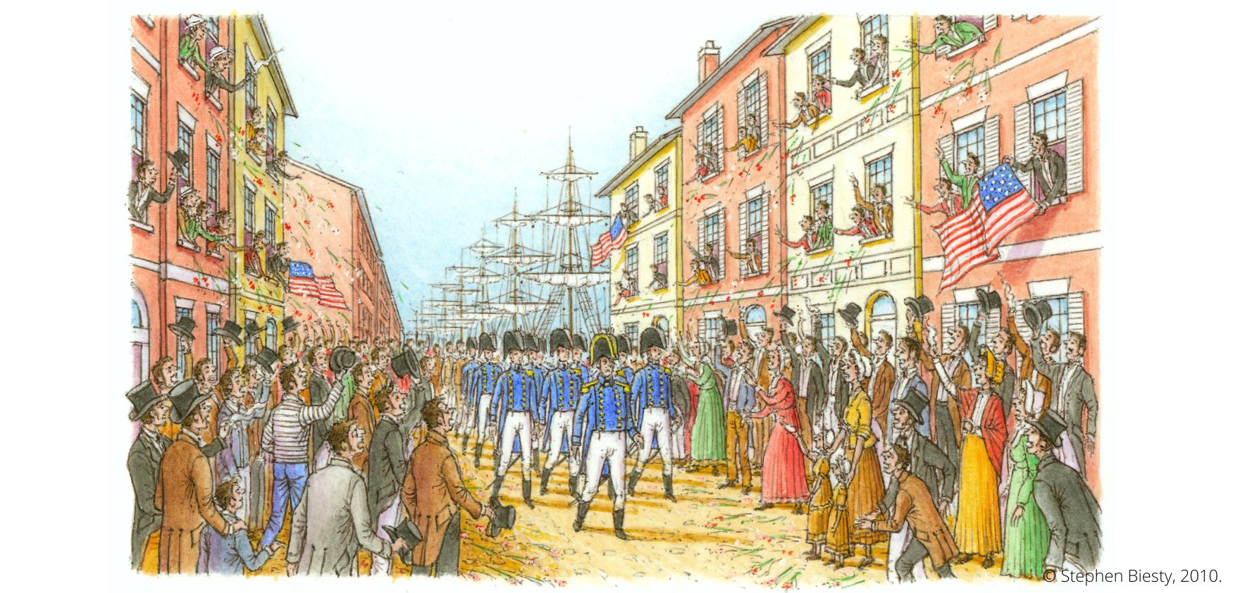 Huzza! HUZZA! The captain and crew of Constitution were heroes! News of their victory over Guerriere spread fast as soon as Constitution returned to Boston. So when captain Isaac Hull stepped ashore on the first day of September, the whole city greeted him. Flags flew. Bands played. Cannons fired deafening salutes. And flowers rained down as the captain led his officers down Long Wharf, to a party at the city’s finest building, the Exchange Coffee House.