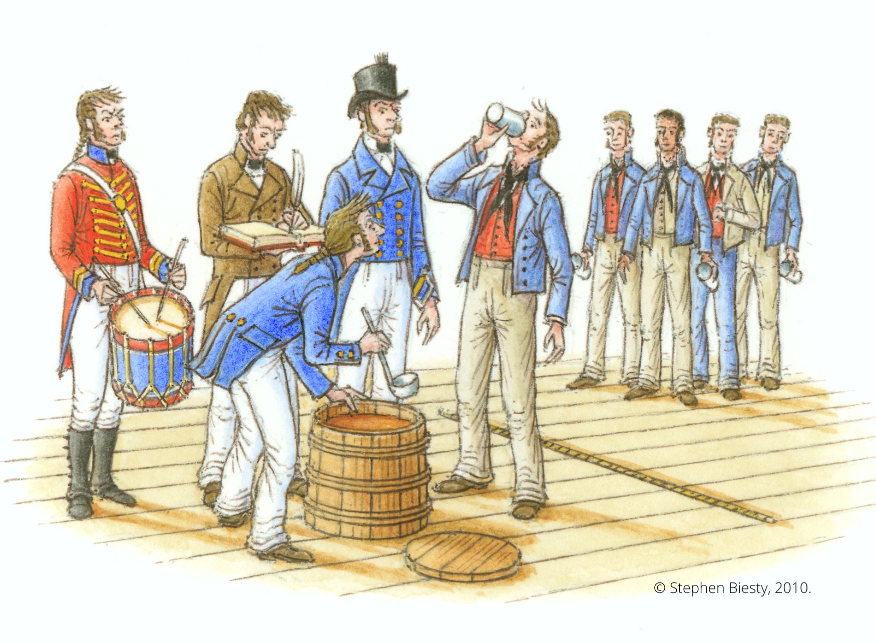 To a sailor on Constitution, there was no happier sound than the ringing of seven bells in the forenoon watch. These chimes signaled it was time for grog: a whisky-and-water drink served just before meals. To stop sailors hoarding it and getting blind drunk, they had to swallow their ration while an officer