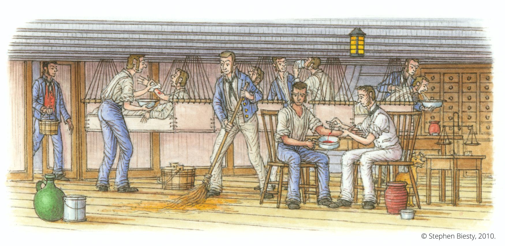 Constitution’s crew are a healthy lot. Few catch the infectious diseases that on other ships are more deadly than enemy cannon. And if a sailor does fall ill, he is soon treated. In the sickbay surgeon Amos Evans and his assistants usually care for a dozen or more patients. Rest, cleanliness and a better diet cure most of them, but the medical treatment they get is little help. Lacking modern drugs and medical knowledge, the surgeon’s prescriptions harm patients as often as healing them.