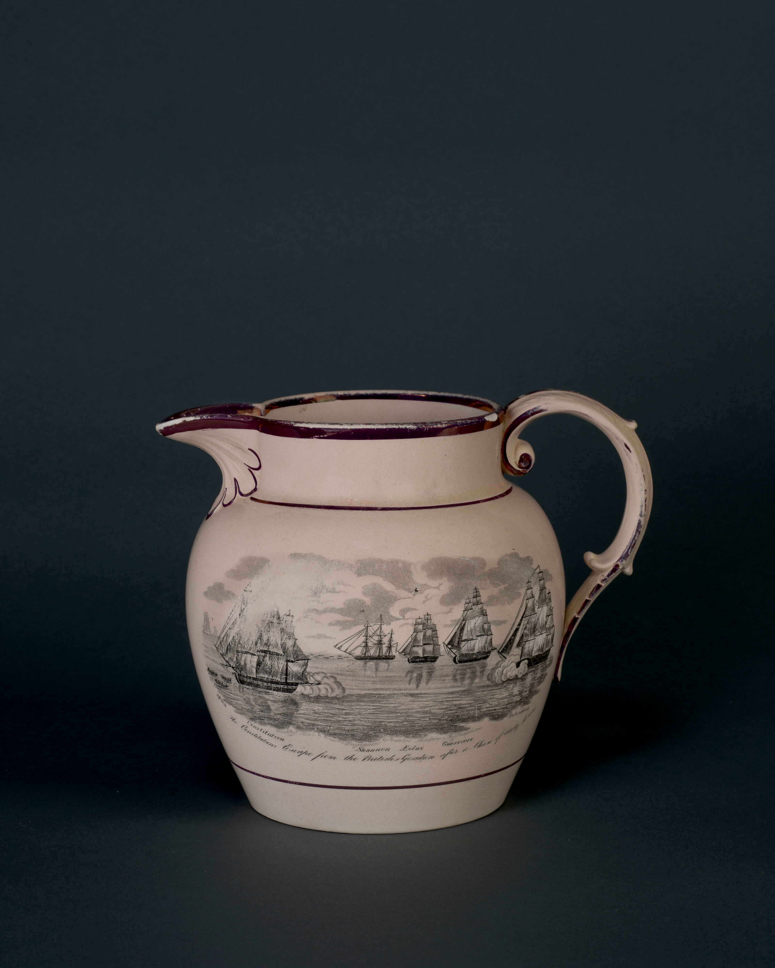 This ceramic pitcher depicts two of USS Constitution‘s exploits during the War of 1812. It is an example of the many pitchers, plates, bowls, mugs, and vases that glorified the accomplishments of the new United States, motifs which were popular among Americans.