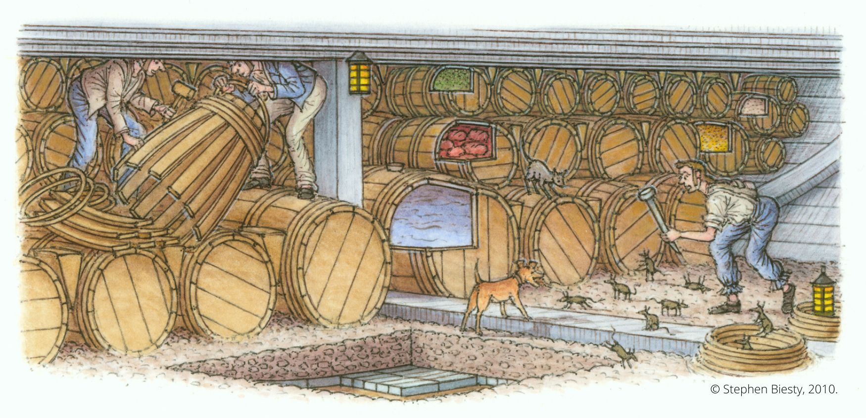 In the deepest, darkest, dingiest place at the very bottom of Constitution is the hold: a gigantic wooden warehouse. Here, packed tight in barrels, is enough food, water and other provisions to supply the ship for six months. However, the crew won’t eat and drink all of this. They share it with hundreds of rats. Rats don’t just eat the tubs of bread, meat, cheese and beans. If the crew don’t control them, they can even gnaw holes right through the ship’s hull.