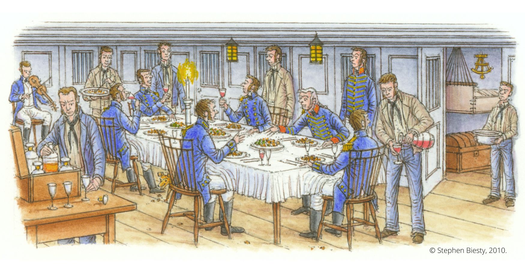 Sitting down in their wardroom for dinner, Constitution’s officers look just like gentlemen ashore dining in a good restaurant. Indeed, they eat far better than the seamen they command. They club together to buy fresh food, preserves and wines. Their servants act as cooks and waiters. These are not the only